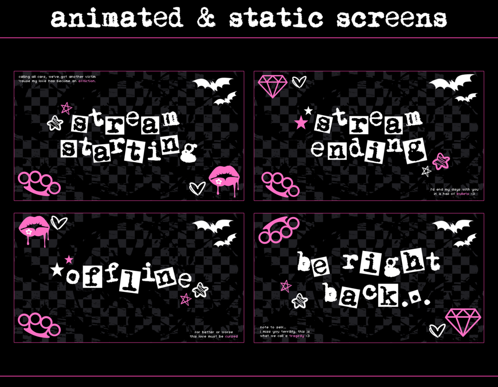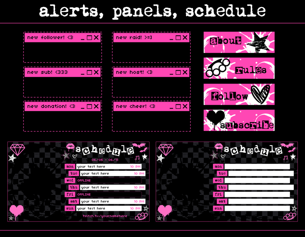 This theme is modeled after y2k emo aesthetics with unlimited options. Easy to customize in Photoshop or OBS.