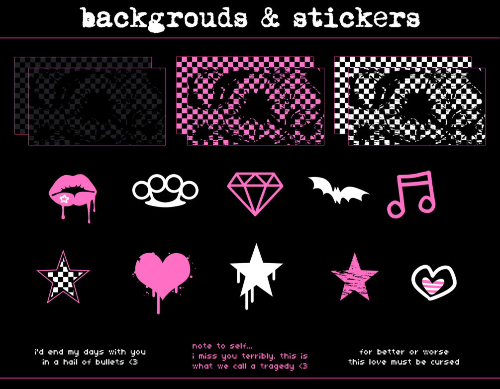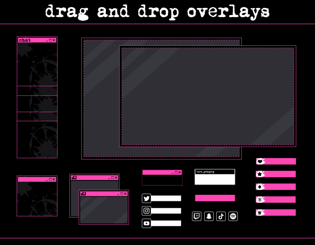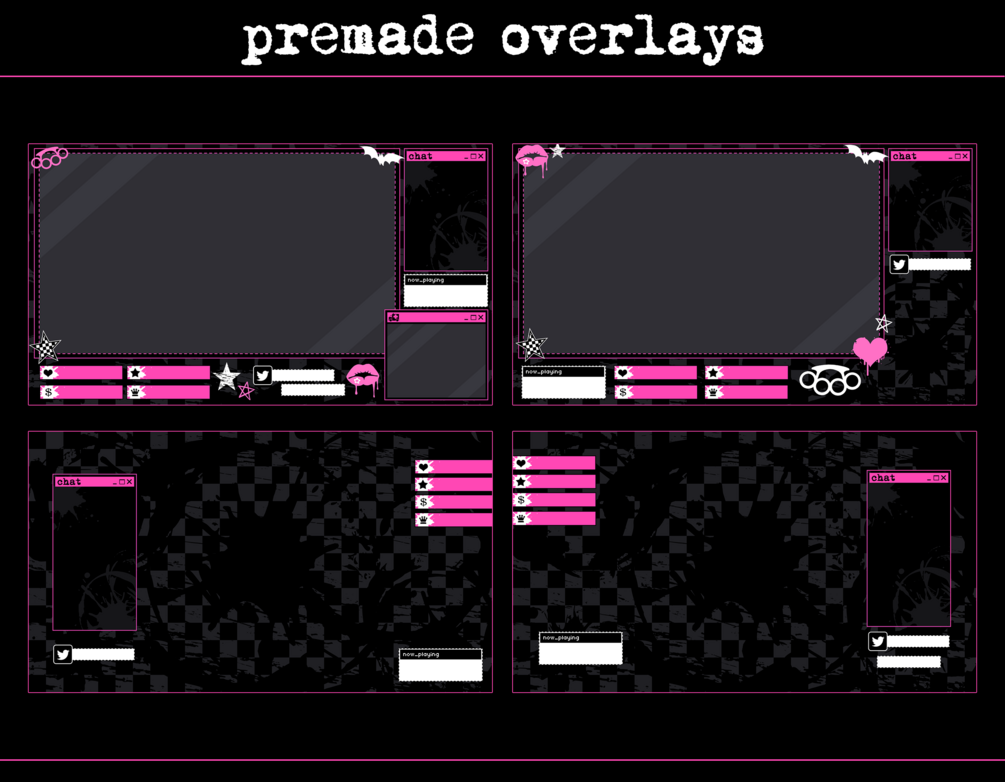 This theme is modeled after y2k emo aesthetics with unlimited options. Easy to customize in Photoshop or OBS.