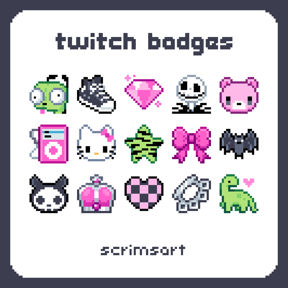 Pixel art twitch sub badges or bit badges of Emo/Scene themed items.