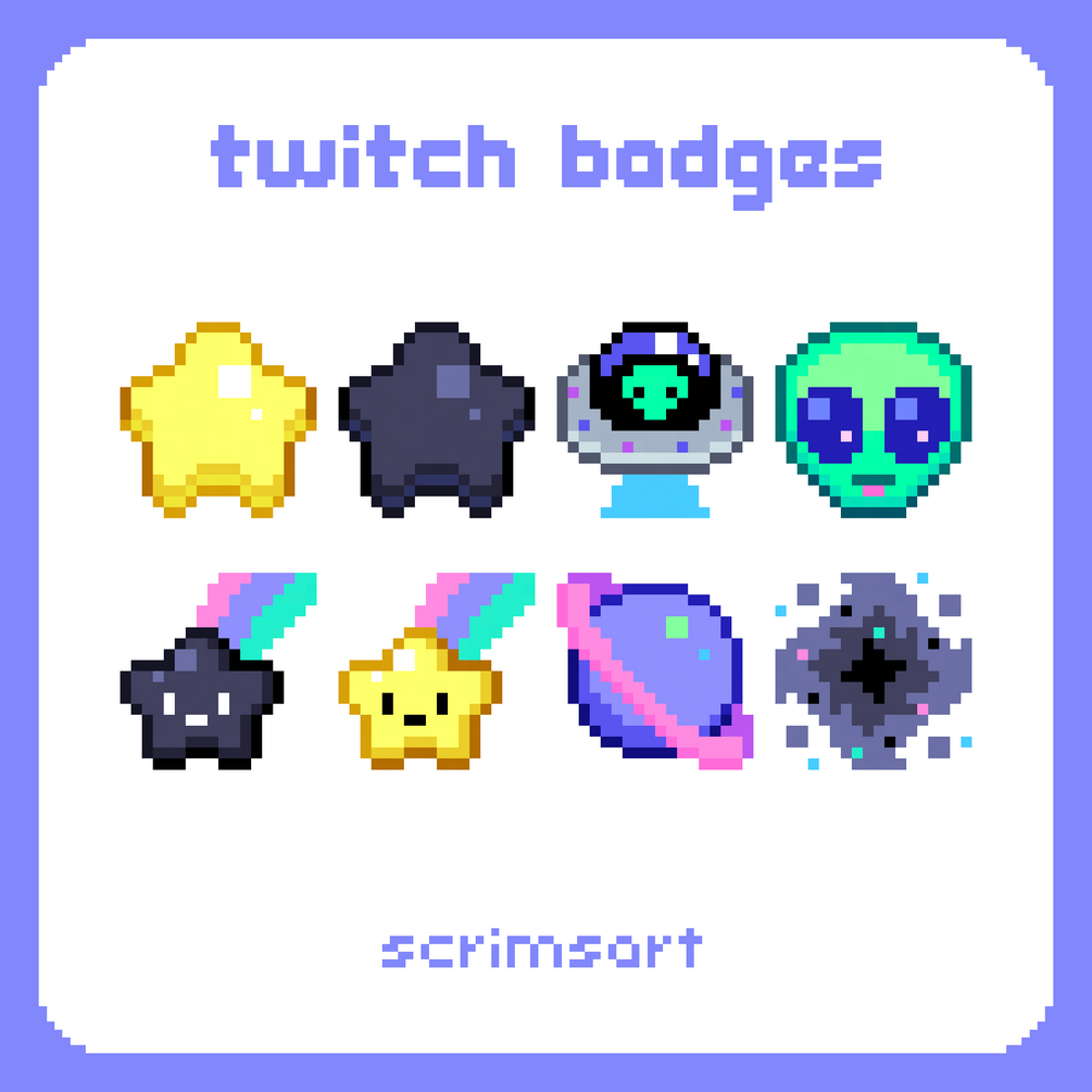 Pixel art twitch sub badges or bit badges with an outer space theme.
