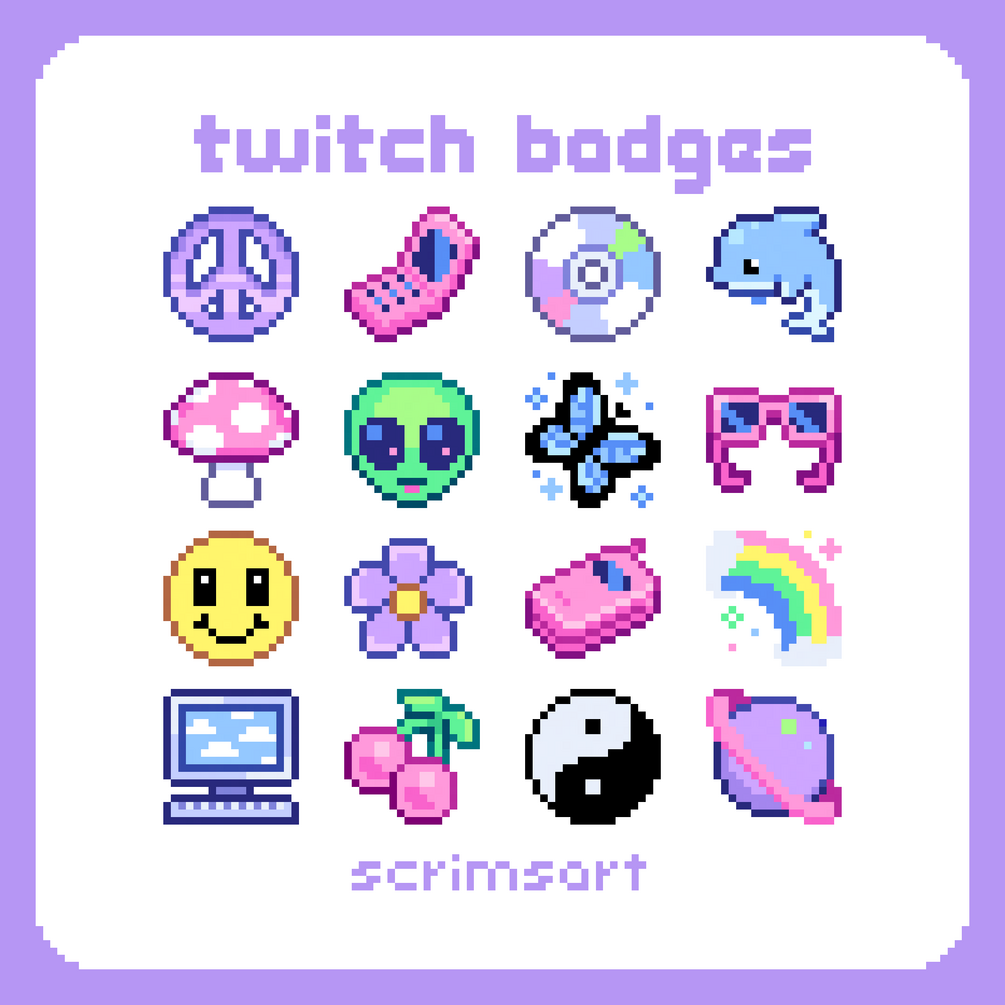 Pixel art twitch sub badges or bit badges with psychdelic Y2K themed items.